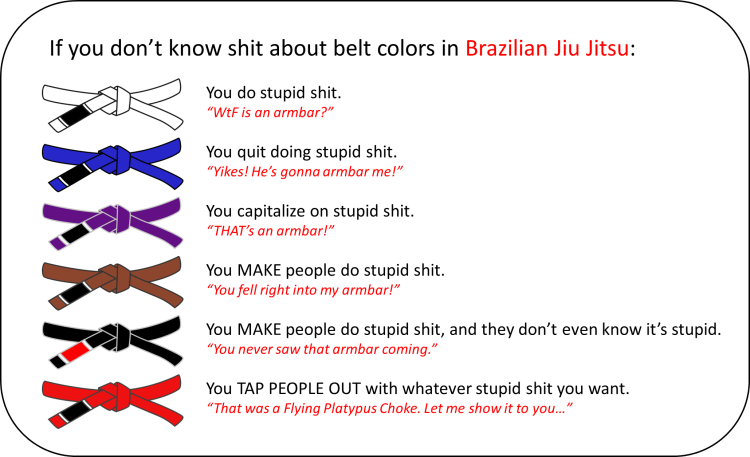 Understanding rank in Brazilian Jiu-Jitsu July 26, 2012 @BryanEdge_S Martial Arts, Shenanigans Leave a comment Wondering about the different belts in Brazilian Jiu-Jitsu? Criteria for earning the rank? What the colors mean? Then this probably won’t help you. Rank in Brazilian Jiu-Jitsu (Adult ranks) Share this: Click to share on Facebook (Opens in new window) Facebook Click to share on X (Opens in new window) X Click to share on Pinterest (Opens in new window) Pinterest Click to share on Reddit (Opens in new window) Reddit Click to email a link to a friend (Opens in new window) Email Click to share on LinkedIn (Opens in new window) LinkedIn Click to share on Tumblr (Opens in new window) Tumblr Like Loading... Related