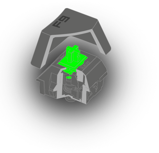 Cherry MX Brown, Black, Blue, and Red – meet Razer Orange and Razer Green. The Razer Green switch is tactile and clicky, requiring a force of 50g to actuate; and the Razer Orange switch that is tactile yet silent, requiring a force of 45g to actuate.