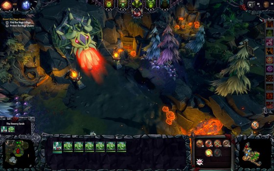 The real fun is building up your mighty horde in the first place, and then having them storm through the over world in an unstoppable tide of fire and bloodlust. This is made all the more satisfying because the territory you capture in the over world is immediately ‘Evilified’, and turned from happy-rainbow-land to the suburbs of Mount Doom, mired in smoke, fire, and endless crevasses that will forever echo your Muahahahahas. (Perhaps more importantly, you can only cast spells – lightning bolts, buffs, etc—in territory that is under your influence.)